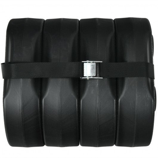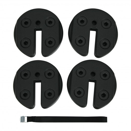 This 4-piece weight plate set will be the ideal solution! Made of high-quality PE our weight plates are durable and resistant to aging or cracking. The no-pinch design enables easy and safe installation without hurting fingers. The 1 1/4” wide open slot is suitable for most canopy legs. It is worth mentioning that each weight plate has an injection spout that allows you to fill in water or sand to increase the weight to better hold down the canopy. If necessary you can also choose to stack weight plates together. Compared with sandbags our canopy weights are more beautiful and portable suitable for outdoor events such as picnics parties trade shows etc. If you are looking for a weight plate set like this do not hesitate to place an order! Made of weather-resistant PE for long-term outdoor use With the no-pinch design for easy and safe installation Male and female connection for secure stacking Can be filled with water or sand to increase weight Securely fits all canopy poles up to 1.25” wide Firmly secure tents canopies and umbrellas in place Suitable for outdoor events such as trade shows picnics and parties With a strap for easy transportation and to prevent the weights from scattering