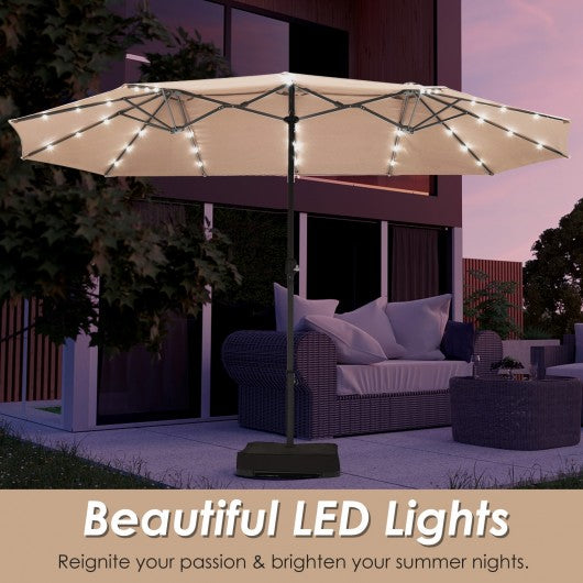 15 Ft Solar LED Patio Double-sided Umbrella Market Umbrella with Weight Base-Beige