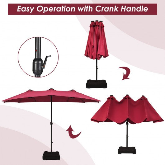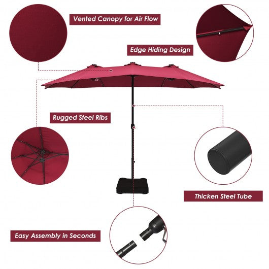 15 Ft Solar LED Patio Double-sided Umbrella Market Umbrella with Weight Base-Red
