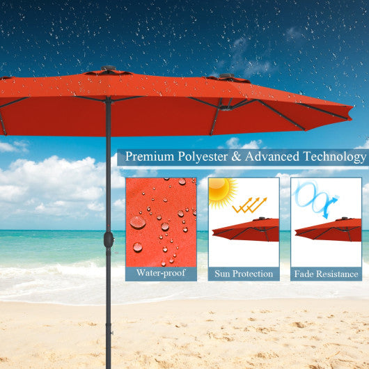 Specification: Color: Dark Red/Tan/Beige/Orange Material: Steel polyester Umbrella dimension: 15 Ft x 8 Ft (W x H) Net weight: 27 lbs Rib number: 12 Air vent: Yes Light Type: Solar-powered pre-installed LED Number of lights: 36 LED 3 on each of the 12 ribs Recommend base: 91028346 Package Include: 1 x Patio double-sided umbrella 1 x Instruction