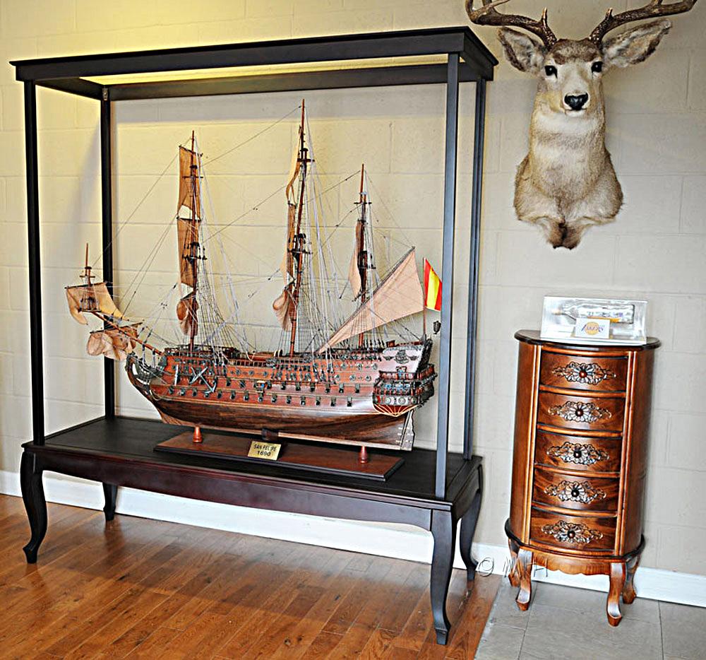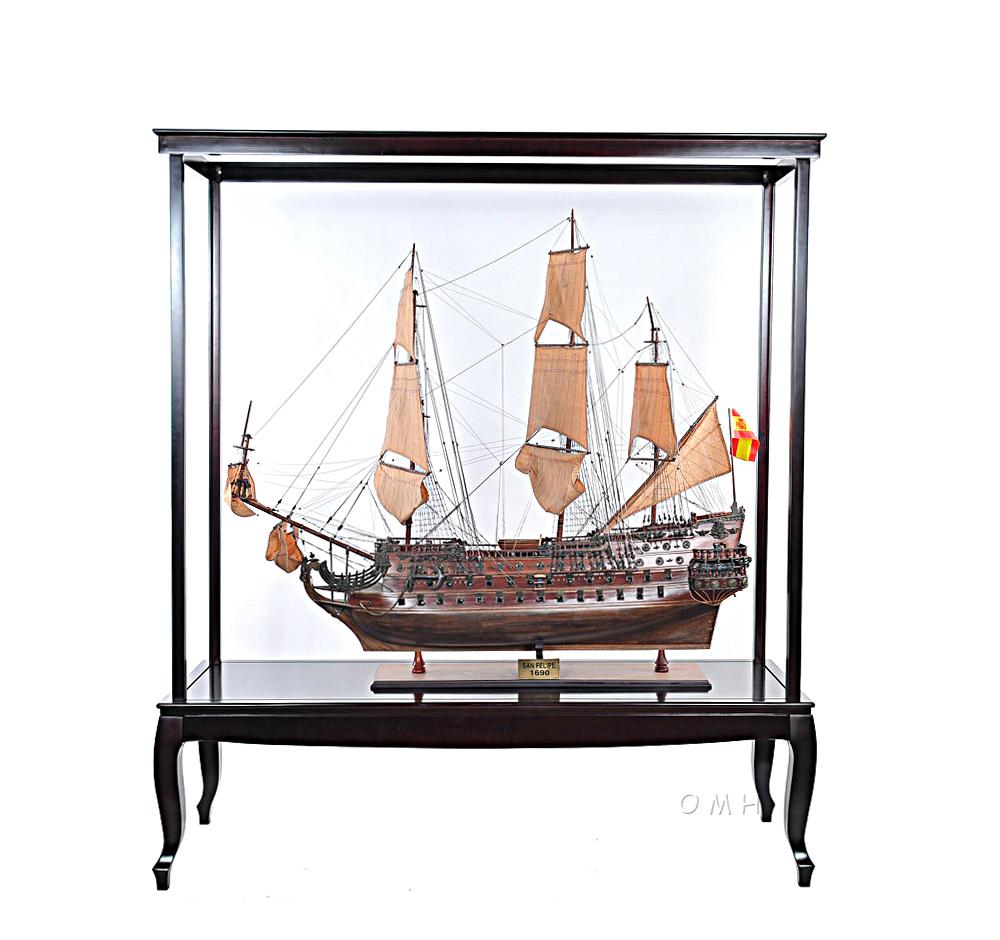 This beautiful display case was made out of hard wood and painted in dark mahogany color. It has distinctive design that add elegance and beauty when displayed in your home or office. It is used to display all tall ship 56 inches expert levels such as HMS Victory 56 XL and USS Constitution 56 XL. This case is very effective when it comes to preventing dust particles as well as keeping your valuable tall ship looking new and protected at all time. It is a must have for model ship enthusiasts or passionate collectors. This display case is shipped with the frame and legs fold down to save on shipping cost. It is packaged securely with thick foam layers inside a wooden crate and ship safely via FedEx ground. The maximum inside dimension is L: 61.25 x W: 18.25 x H: 55.75 inches. Note: This display case only comes with table, legs, and frame (no glass panels included).