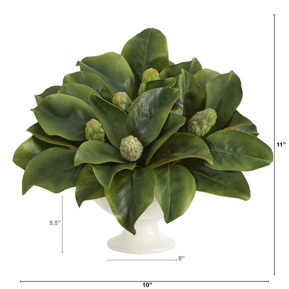 Add a sense of natural freshness throughout everyday spaces with this artificial plant boasting an overgrowth of forever-green magnolia foliage, delicately accented with flowering buds to-be. Incredibly lifelike and perfect for year-round display, this handsome fake plant stands 11" high from its white pedestal planter.