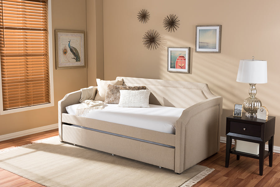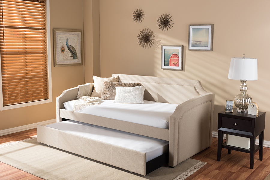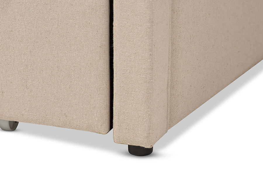 Baxton Studio Parkson Modern and Contemporary Beige Linen Fabric Curved Notched Corners Sofa Twin Daybed with Roll-Out Trundle Guest Bed