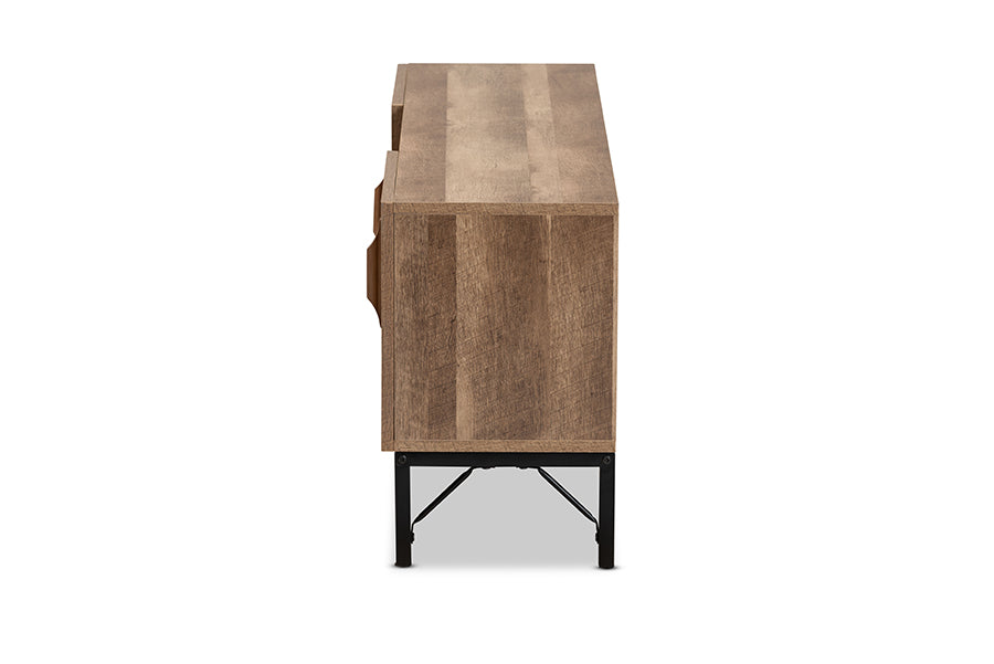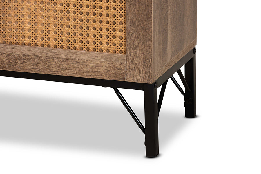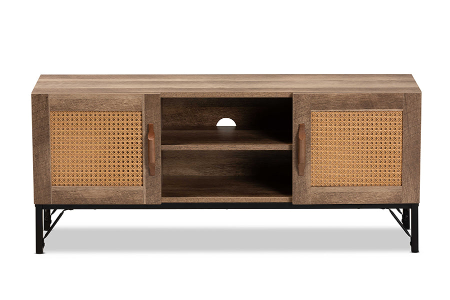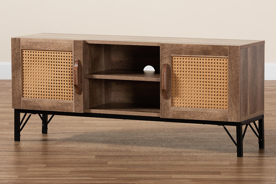 Baxton Studio Veanna Bohemian Natural Brown Finished Wood and Black Metal 2-Door TV Stand with Synthetic Rattan