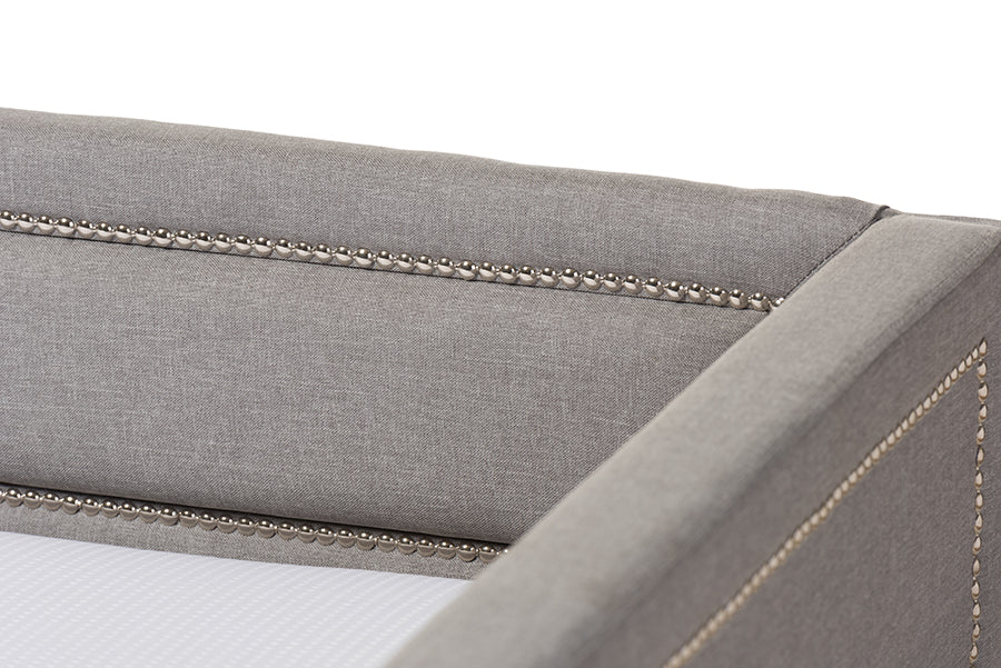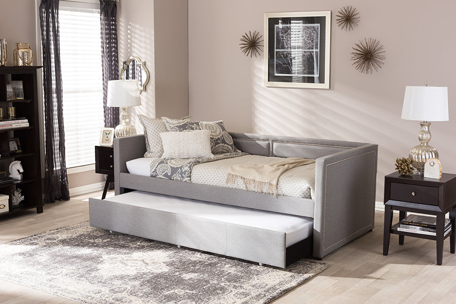 Baxton Studio Raymond Modern and Contemporary Grey Fabric Nail Heads Trimmed Sofa Twin Daybed with Roll-Out Trundle Guest Bed