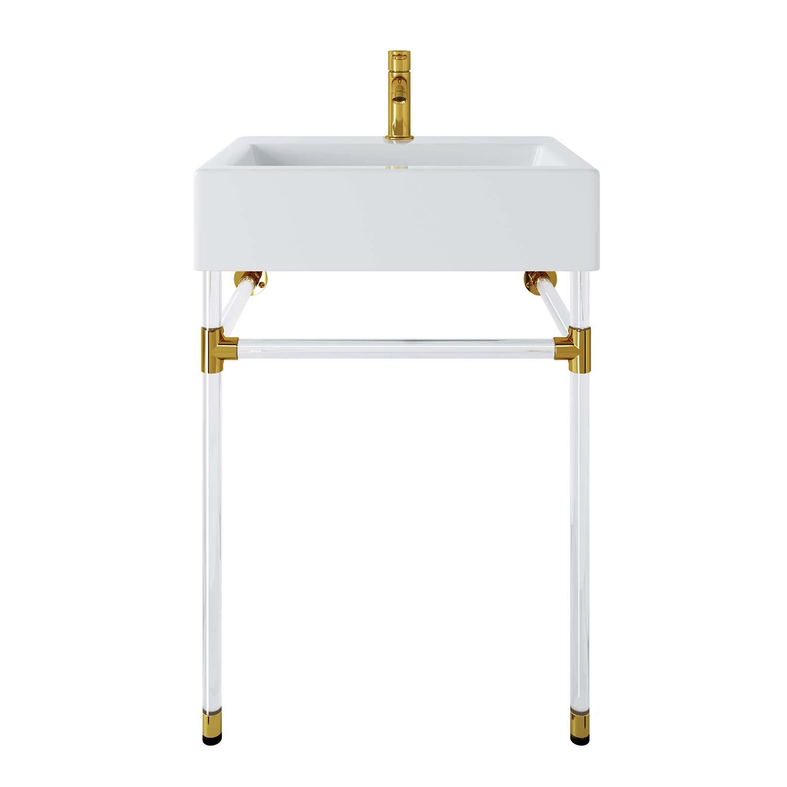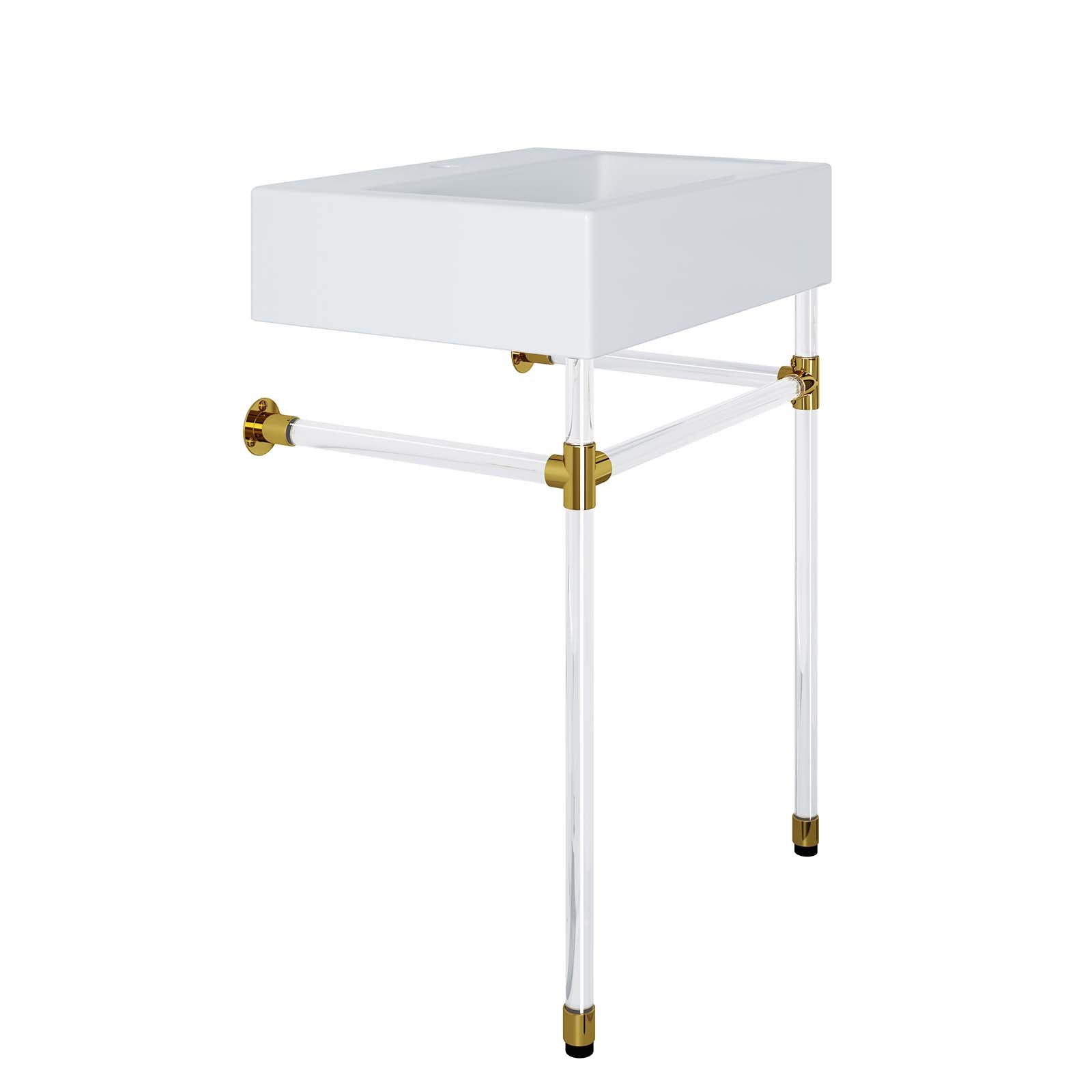 Create a bathroom oasis with the minimalist style and efficiency of the Redeem Wall-Mount Acrylic Bathroom Vanity. The glossy white ceramic sink basin and streamlined acrylic frame affix directly and securely to the bathroom or powder room wall. Redeem dispenses gentility in spaces large and small, resting confidently on a sturdy acrylic frame with gold joints for added stability. This small bathroom vanity has a single faucet hole and is outfitted with non-marking foot caps to protect your bathroom floor. Assembly required and fixtures not included. Set Includes: One - Redeem 24" Acrylic Wall-Mount Bathroom Vanity