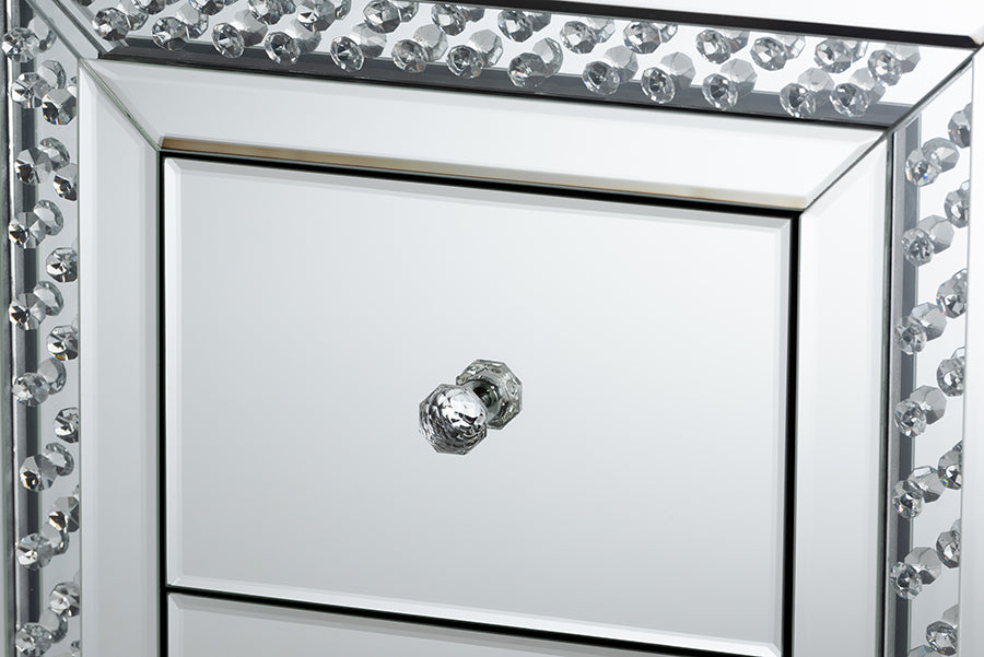 Add a touch of glamour to your bedroom with the Mina nightstand. The Mina is constructed from solid MDF wood and beveled mirrored glass. Three drawers provide ample space to store headphones, lotion, and other bedside essentials. The nightstand showcases two panels overlaid with crystal beads, which magnificently reflect the light within the room. Crystal drawer knobs add a decorative touch and provide easy access to the drawers. The Mina nightstand is made in China and will arrive fully assembled.