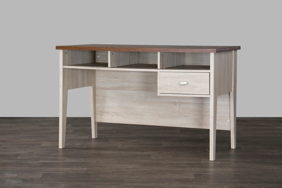 Our Tyler Writing Desk has flair to spare. This contemporary piece is more than a desk, it’s an accent in its own right. Sure, its generous storage space makes it practical, but its dashing design-featuring two-toned wood hues and a genuine metal drawer pull-encourages placement beyond home-office confines.