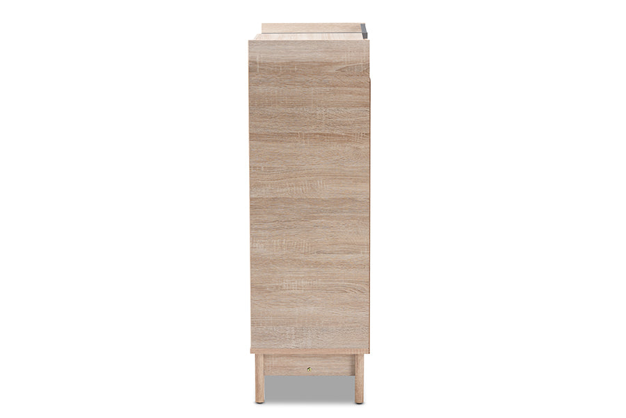 Inspired by sleek Scandinavian design, the Fella cabinet is an exquisite addition to any entryway. Constructed from engineered wood, the Fella displays a two-tone oak and dark grey finish for visual interest. Two doors open to reveal four shelves with storage space for up to 12 pairs of shoes. Additional storage space is provided by an open shelf and lift-top storage compartment. Mid-century modern design influence is evident in the angled, tapered legs of the Fella. The Fella is made in Malaysia and requires assembly.