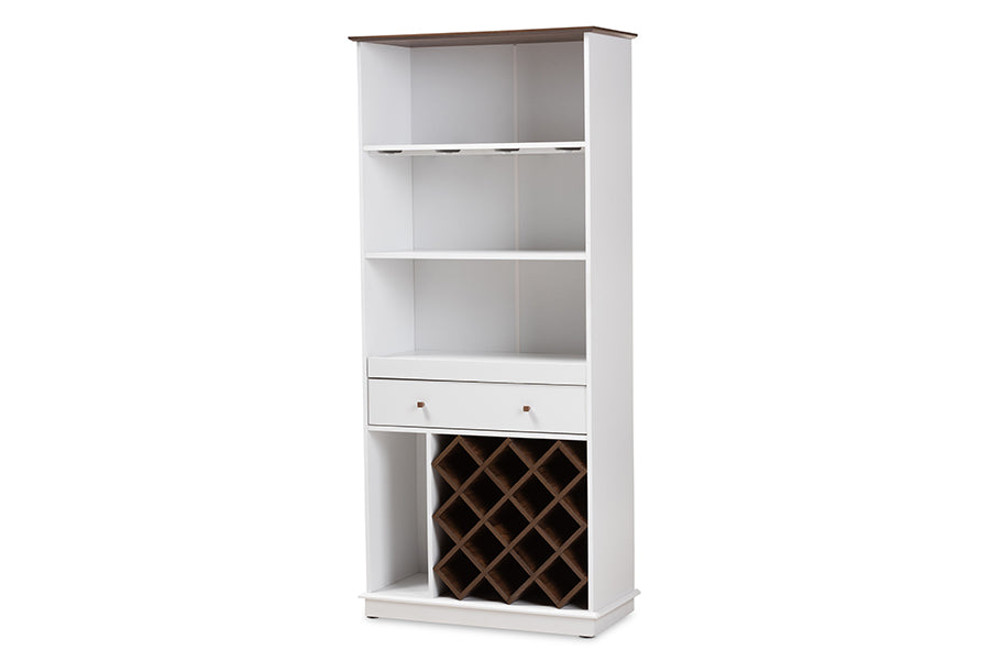Featuring a built-in wine rack and glass holder, the Mattia wine cabinet is essential for any wine connoisseur. The Mattia is constructed from engineered wood for durability and displays a sleek, neutral finish. The cabinet features a built-in wine rack with space to store up to thirteen bottles of wine. Four open shelves provide additional storage space, with one of the shelves containing a stemware rack that can hold up to eight wine glasses. The cabinet is also fitted with a pull-out tray that makes it easy to prepare drinks. A large drawer beneath the tray contains storage for bottle openers, wine stoppers, and more. The Mattia wine cabinet is made in Malaysia and requires assembly.