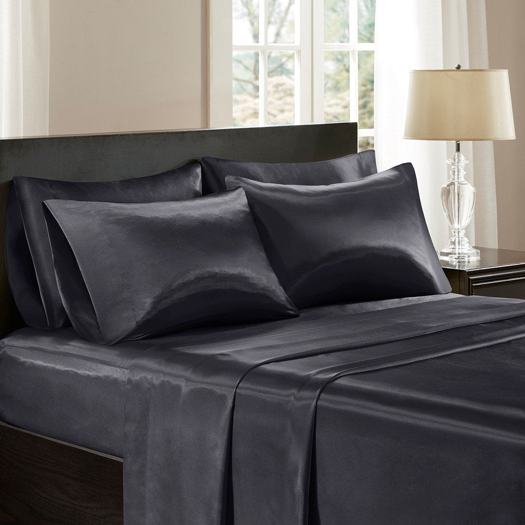 These silky high luster satin sheets are luxurious on any bed all year round. It has naturally wrinkle free properties and are machine washable. Fits up to a 16 inch mattress. Available in black, gold, red, taupe and chocolate colors. Also available in cheetah and zebra prints. Includes 1 Flat Sheet, 1 Fitted Sheet and 4 Pillowcases.