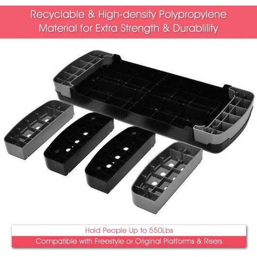 Specification: Color: Black & gray red signal Material: ABS Platform size: 31" x 10.5 x 3.5" (L x W x H) Adjustable height: 4"- 6"- 8" Each riser size: 12" x 4" x 2" (L x W x H) Weight capacity: 550 lbs Unit weight: 8.8 lbs Package includes: 1 x Platform 2 pairs of risers
