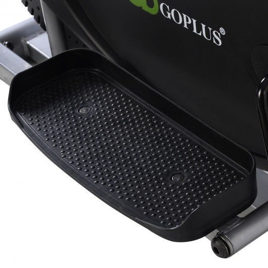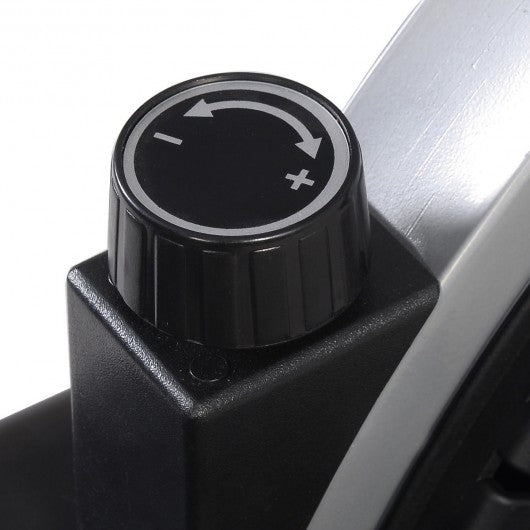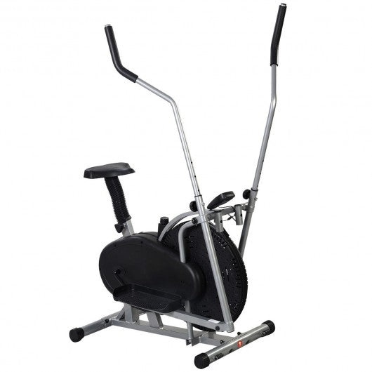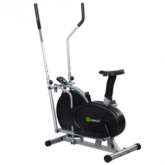 This is Goplus elliptical fan bike which is an excellent and professional indoor cycling. Riding this stationary bike you will keep health and fit. Simple appearance effective calories consuming and durable frame are main three advantages of this exercise bike. The seat can be adjustable. It provides electrode less speed change and ultra-comfortable sport saddle. The fan wheel can run quietly and smoothly. Welcome! Don't hesitate to buy it! Brand new and high quality Ideal for indoor healthy and fitness exercising Durable frame Seat can be adjustable up and down Motion handlebars provide and upper- and lower-body workout Adjust resistance level by adjusting the friction knob Chain-driven fan resistance is quiet and smooth Electrode less speed change Ultra-comfortable PU sport saddle Top-down easy-to-use resistance system (felt brake pad) Plastic Pedals LED display: distance speed lasting time calories