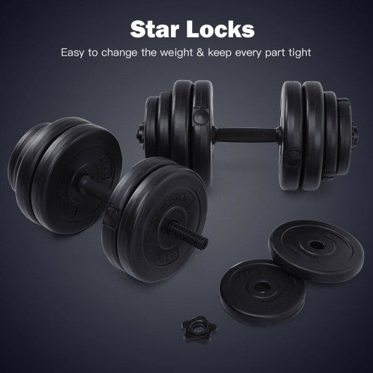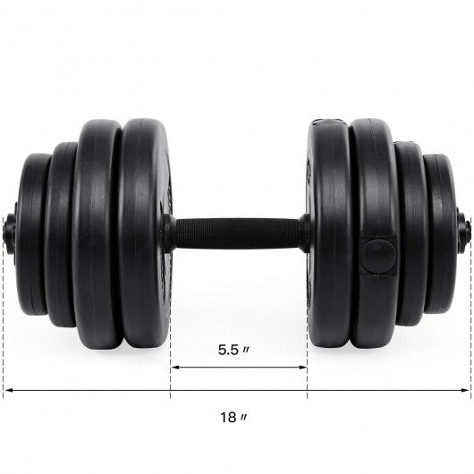 Specification: Color: Black Material: Propene polymer (plates) + Steel with propene polymer (rods) Weight limit: 220 lbs Size of the bar: 18 inches x 25 mm (L x Diameter) Section number of bar: 1 Weights: 8 x 2.5 kg (5.5 lbs) plates 4 x 1.25 kg (2.75 lbs) plates 4 x 0.75 kg (1.65 lbs) plates Package includes: 2 x tubular rods 8 x 2.5 kg (5.5 lbs) plates 4 x 1.25 kg (2.75 lbs) plates 4 x 0.75 kg (1.65 lbs) plates 4 x Buckles Note: 1. Please warm up fully before training to avoid physical injury. 2. 64 lbs dumbbell set comes with weight plates set (2.5 kg x 8 pcs 1.25 kg x 4 pcs 0.75 kg x 4 pcs) 2 tubular rods and 4 buckles. 3. Please consider the weight limit before changing the weight plates of your own.