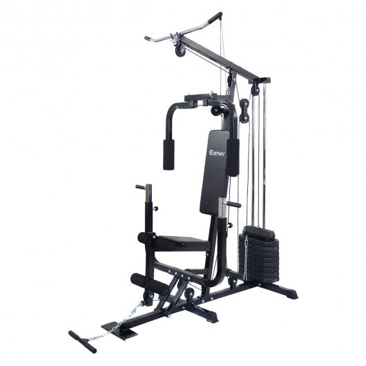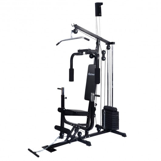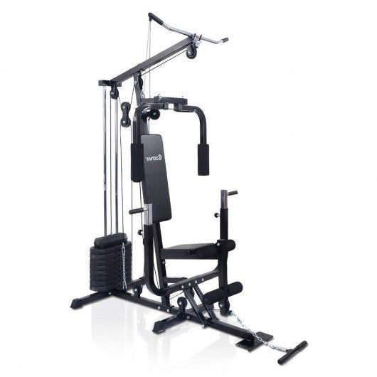 Save yourself the time and hassle of a gym membership with this gym system strength training workout equipment. This complete workout unit includes everything you need to engage your entire body for better health and more powerful lean muscle growth. It features a high and low pulley system with up to 220 lbs of resistance. Use it to target and tone multiple muscle groups. It also has a combined chest presstterfly arms station with a 4-roll leg developer. Store it in a spare room or a garage for easy access. It has a sewn vinyl seat for a comfortable workout experience and comes with a step-by-step exercise chart to ensure you're maximizing each movement. When it comes to building your fitness a home gym is a good alternative or supplement to a full gym membership. 6 muscle-sculpting workout stations include a high pulley chest press chest fly leg developer preacher curl and low pulley station 90 lbs weight stack offers the ideal combination of durability and fluid motion 4-foam leg developer facilitates lower body muscle development made of durable steel tubing and designed for long-term use Up to 220 lbs of resistance Fitness home gym has a combination chest press and butterfly arms station with 4-roll leg developer made of durable steel tubing and designed for long-term use High and low pulley with a lat bar Increase your training effectively Assembly required