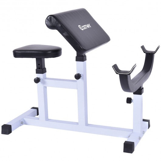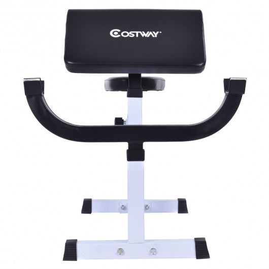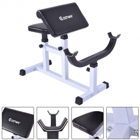 This curl weight bench which is perfect for strength training and biceps workout. It is equipped with seated arm to fit your body in a proper shape. The height can be adjusted to meet different levels of exercising. Strong steel frame and solid construction make the product could support at most 350 lbs so most people can use it. It is ideal for home use. You could exercise whenever you want. Welcome! High quality with competitive price can be realized here! Brand new and high quality Strong steel frame and solid construction Comfortable seated arm for exercising Adjustable height to meet various strength levels Large weight capacity of 350 lbs