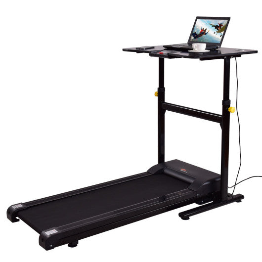 The treadmill featuring a desk is perfect to be used in your office or home. The console is integrated directly within the armrest of the standing desk providing all the activity feedback you need including mode walking time distance calories and speed. The quiet operation lets you stay respectful of coworkers while you are walking for miles each day without impacting office productivity. The standing desk adjusts from 39" to 46" allowing you to find proper ergonomic positioning whether short or tall. The wide desktop provides a spacious working area for all your office supplies. Don't hesitate to add it to your cart! 5-level height adjustable from 39" - 46" Extra large desk workspace area LED display screen: Time / Speed / Distance / Calories / Mode 2 modes: auto mode and manual mode Quiet operation without impacting office productivity Burn calories decrease stress levels and reduce low-back pain