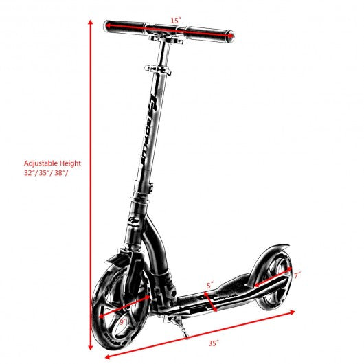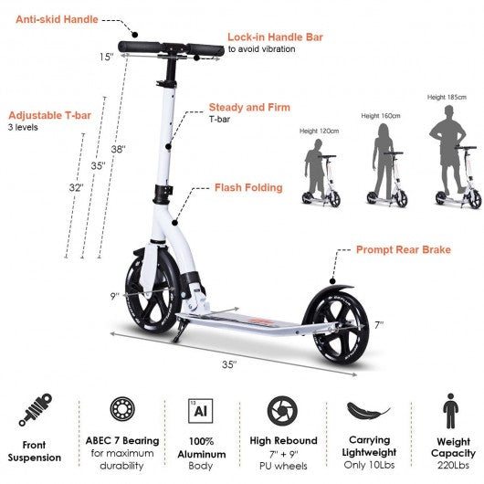 Specification: Material: Aluminum alloy + PU wheels Color: As the pictures show Product dimension: 35" x 15" x (32"-38") (L x W x H) Handle height adjustable range: 32"- 38" Front wheel size: 9" Rear wheel size: 7" Item weight: 10 lbs Weight capacity: 220 lbs Recommend age: 12+ Package include: 1 x Kick scooter