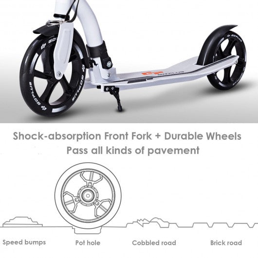This teen kick scooter which is suitable for uneven pavement and surfaces with high bounce and for smooth and comfortable cruising. Benefiting from its lightweight frame and use it for long-distance commuting on your college campus on the bus or on the train. It comes with a shoulder strap so you can strap the kick scooter over your shoulder when you need to transport it somewhere. It’s not suitable for children under 12 or tricks and stunts. Get it now and always have a ride wherever you go! Made of Aluminum alloy lightweight but sturdy All components and surface finish are environmentally non-toxic 9" big front wheel can easily overcome uneven pavement and surfaces Comes with a retractable kickstand making parking easily Handlebar height adjustable from 32" to 38" Easy to fold up for convenient storage and for riders to carry on the go Comes with a shoulder strap with which you can strap the kick scooter over your shoulder Boasts a convenient front hand brake with shock-absorbing effect