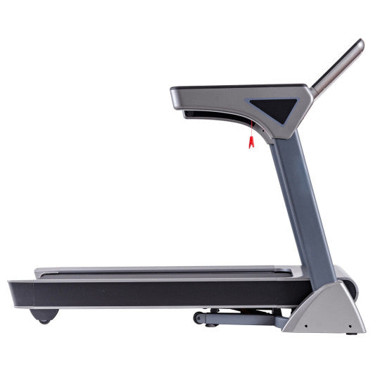 Everything you need to reach your fitness goals lives on the this Goplus high-configured treadmill. Featuring cool and fashion shape super sturdy structure intelligent functions offer you an unparalleled running experience. 7" LED display supports touch operation and shows time distance speed incline level heart rate calories modes and a heart rate table. The 3 HP large motor ensures the stable and efficient operation of the machine and does not cause much noise. The treadmill can be easy fold and unfold with a gas rod supporting. Don't hesitate to buy it! Super-large running space & LED touch operate display: Features with 64" x 26" large rubber running belt and 30" handrail spacing this electric treadmill is suitable for any body type users. 7" LED display supports touch operation shows time distance speed incline level heart rate calories modes and a heart rate table 3 hp impulse max motor & built-in rubber vibration system: The 3 HP large motor ensures the stable and efficient operation of the machine and does not cause much noise. Built-in rubber vibration system also ensures the quite of the treadmill will not disturb downstairs or neighbors perfect for home use 15 built-in workout programs & 16 adjustable speed levels: There are 15 different built-in workout programs for choose different program has different preset speed incline level and time. 1-16mph easy set speed levels are available for different exercising requirements 15% quick electric incline levels & safety key design: This treadmill supports 1-15% electric incline levels adjustment. The large the incline level the greater the exercise intensity. The safety key links user and the treadmill which can quick stop the machine in an emergency Foldable design & transportation wheels: The treadmill can be easy fold and unfold with a gas rod supporting. The wheels allow the machine transport from one room to another room easily