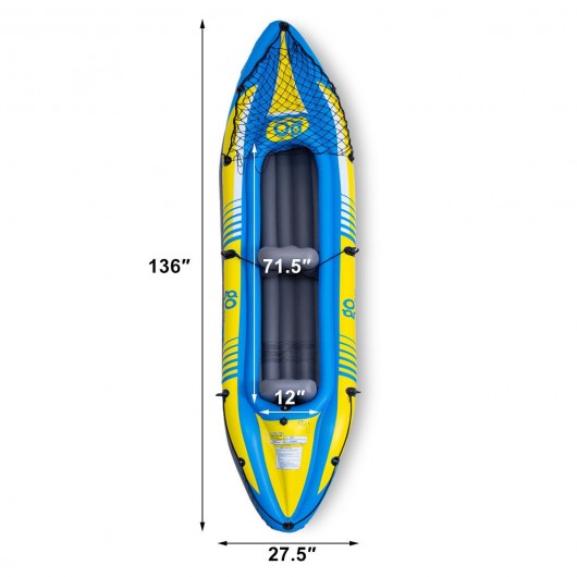 Specification: Item dimensions: 136" x 27.5" x 14" Material: PVC The length of the paddle: 89" Item Weight: 24.5 lbs Weight capacity: 352 lbs Item include: 1 x Kayak 2 x Paddles 1 x Hand pump