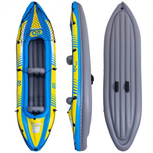 Our nimble and durable kayak is made of durable PVC material with eye-catching graphics it is an indispensable cool thing through the hot summer. This kayak helps you to enjoy the hot summer in a cool way. It combines the highest quality materials workmanship and top notch accessories at an unbeatable price. Its deluxe and streamline design makes for easy paddling on both lakes and mild rivers all while remaining lightweight and compact. Its cockpit features one adjustable seat with backrest elastic safety pulling rope on both ends for quick and convenient towing. Thoughtfully designed constructed and tested by a team that lives to paddle.With this specially designed inflatable canoe boat your summer life gets more interesting than usual. Adjustable seat: Kayak includes two adjustable inflatable seats with backrest to ensure the comfort of the cockpit and adjust the space as needed Safety design: The kayak has three blowholes and is independent of each other. Even if one blowhole is damaged the other two can work as usual reducing the risk of accidents in use Simple use: Using a hand pump to quickly inflate the kayak the bow and stern are equipped with elastic safety pulling rope for quick and convenient towing and a black baggage net belt provided with extra storage at the head of the kayak Easy to carry: It weighs only 24.5 pounds but has 352 pounds load capacity. It also includes a carry bag for you to carry around easily Enjoy the speed: Sports and interesting streamlined design plus V-shape bow it's easy to paddle and enjoy your speed with ease