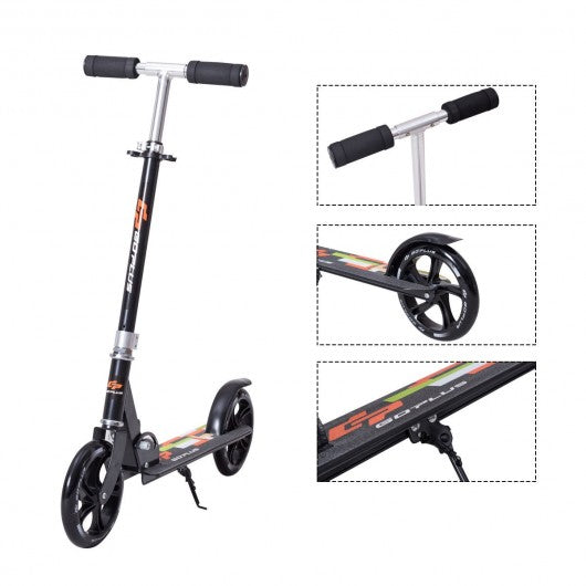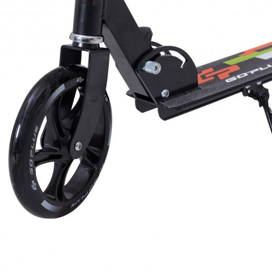 This is our high quality kick scooter 220lbs super weight capacity with 3 levels adjustable height makes it all suitable for adult teens and kids. Made of high strength aircraft-grade aluminum alloy frame rustproof powder coated finish double layer deck high quality 200mm PU wheels and international proved scooter dedicated abec-7 bearings our Goplus kick scooter is definitely your best choice as riding tools for work or school. Features easy folding system and patented rear fender brake. Just simply straighten the safety lock and pull up the folding mechanism and bend down the handlebar you can easily fold it up in 3 seconds. Light aluminum frame weight only 8 lbs. Perfect to ride for work even when you need to transfer to tube train or bus in the half way. It is very convenient to carry and store. The rear mudguard also can be used as a rear brake is made of reinforced and rustproof aluminum. It is very easy to operate by simply pressing the brake pedal with foot to bring this scooter to a quick and safe stops. High quality PU wheels bearings reduce vibration allow high speed provide smooth ride and superior traction over any terrain. Can ride on both indoor and outdoor even no scratch for wooden floor. Well made fine products which is guaranteed to last for years of enjoyment with low also satisfying price all can be realized here! Don't hesitate add it to cart and bring it home! Durable design with 220lbs large weight capacity Extra large 200mm PU wheels Rear brake for safe stops Adjustable telescoping t-handlebars: Features safe lockable device and 3 levels adjustable heights range from 35" to 41" 2 step easy folding design