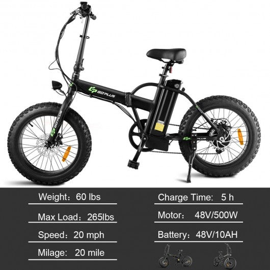 Specification: Color : Black Material : Aluminum alloy Net weight : 60 lbs Max load : 265 lbs Max speed : 20 mph Distance per charge : 20 mile (E-bike mode only) Charging time : 5 hours Motor : 48 V/500 W Rear Hub Brushless Motor Battery : 48 V/10 AH lithium battery Charger : 48 V/2 A Controller : 48 V/18 A Brake : front and rear disc-brake Derailleur : Shimano 7-speed-gears Tire : 4" x 20" Overall size : 68" x 24" x 43.5" (L x W x H) Folded size : 38" x 19.5" x 27.5" (L x W x H) Package includes : 1 x Electric bicycle