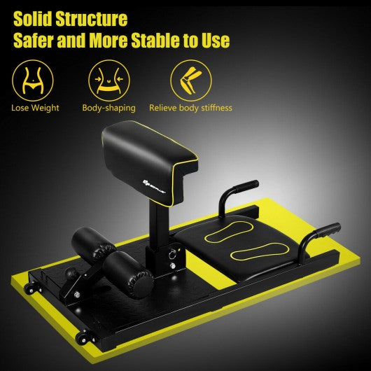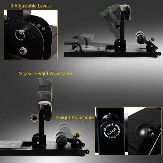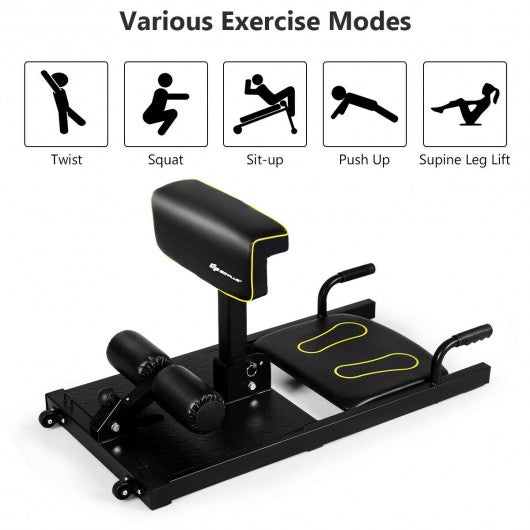This is the 8-in-1 multifunctional fitness trainer which will provide a core workout training to your body. It is ideal body trainer for sit-up back exercise push-up and flat support to greatly exercise your abdomen leg muscles and gluteus. With the load-bearing of 265 lbs this squat is sturdy durable and hard to deform or shake. Bottom is designed into t-shape to ensure its stability. Adjust the heights of the cylinders and mat with the knobs to meet the different people�s needs. Ergonomic leg cushion with PVC+PU cover supports your legs softly to make sports more comfortable. 4 enlarged foot pads at the bottom will prevent skid and protect the floor. Slipping can be effectively prevented due to the non-slip handles and the front pedal. Two wheels in the front will help girls move it easily without much effort. And it can be stored or cleaned very easily. Get one of these sissy squat to maintain a good body shape! 8-in-1 sissy squat combines a variety of core training functions suitable for home gym Perfect to exercise abdomen leg and arm muscles quadriceps and gluteus Thickened iron squat with 265 lbs load-bearing is stable and durable enough for long time use T-shape bottom design to prevent turning over when you are dong exercises 9 levels height adjustable up to 12" for people with different height requirement Ergonomic cushion with pvc+pu cover to support your legs comfortably 4 enlarged non-slip foot pads will increase friction as well as protecting the floor Non-slip handles and anti-skid front pedal strengthens its stability and safety Even girls can move it easily due to the convenient wheels in the front Can be kept into a small size for storage or wiped very easily