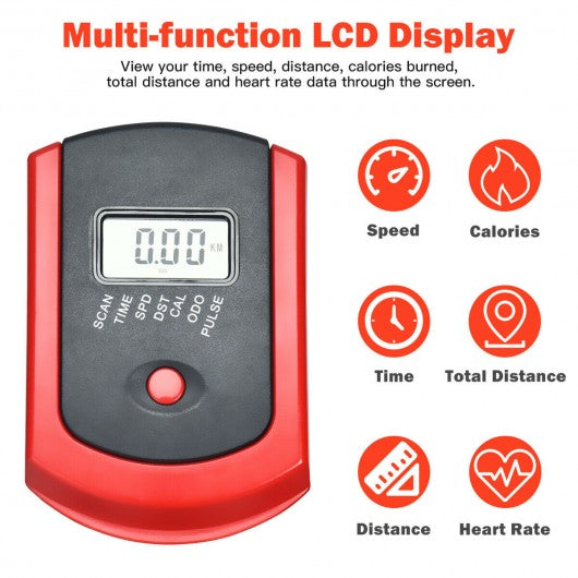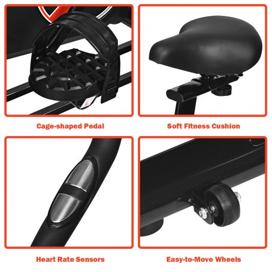 This is the exercise bike which offers you the best training experience! Equipped with heavy-duty metal bracket and cage-shaped ankles the training bikes are sturdy enough to be one of your long-term options. The emergency brake system provides you with security in times of crisis. Besides you can change the resistance to achieve different training intensity and increase the fun of sports. At the same time the handle and seat allow you to adjust the sitting position according to your needs. The two rollers on the bottom make your training full of flexibility. If you are looking for the exercise bike like that don't hesitate to by it! Adjustable seat and handlebar to meet your needs Large seat cushion with 5 positions for improved driving comfort Silent belt drive design ensures smooth and quiet workouts Lcd electronic screen can display your speed time distance calories in time Built-in heart rate sensors on the handlebar to track your heart rate Tension knob for adjusting the movement tension Improve your energy level and strengthen your body Emergency braking system to ensure your safety Prevent your feet from slipping with cage-shaped pedals Easy to move with two underside rollers Sturdy and durable bracket for long-term use 15 lbs flywheel with silent belt drive mechanism for smooth and quiet workouts Perfect for home and gym use