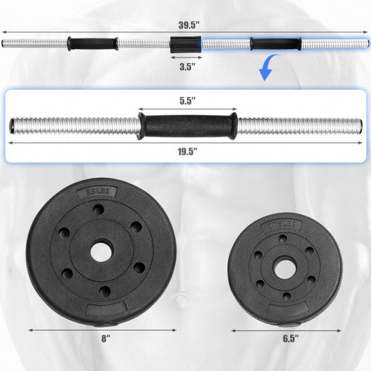Specification: Color: Black Material: Hdpe concrete iron pipe Dumbbell size: 19.5" x 8" x 8" (L x W x H) Barbell size: 39.5" x 8" x 8" L x W x H) Net weight: 70 lbs Package includes: 8 x 5.5 lbs weight plate 8 x 2.75 lbs weight plate 2 x Dumbbell bar 4 x Lock collar 1 x Connecting nut 1 x User's manual