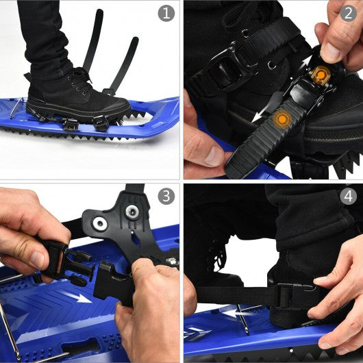 This is the 25-inch snowshoes that will give you the perfect snow hiking adventure! Compared with traditional aluminum frame snowshoes the shoes are made of high quality pp for both durability and portability. The fully adjustable ratchet bindings allow the shoes to match feet of different sizes. And the fast release buckles make it easy to put on and off shoes without complex steps. The reinforced durable metal crampons ensure enough traction on icy or hard road surfaces. In line with ergonomics and streamlined design the products can create ideal floatability and comfort. If you are looking for such a pair of snowshoes don�t hesitate to buy it! High quality low temperature resistant materials ensure durability in severe conditions With scientific streamline design for optimal snow float performance The ratchet bindings can be easily adjusted to fit most footwear sizes Quick release buckles make the snowshoes easy to put on and off The heavy-duty crampons at the bottom will provide you with an ideal grip Heel lift can effectively reduce fatigue when climbing steep slopes Can be used for outdoor activities such as snow hiking mountaineering etc Light weight and a free carrying tote bag make it easy to carry and store