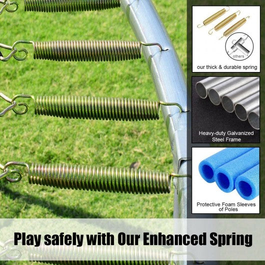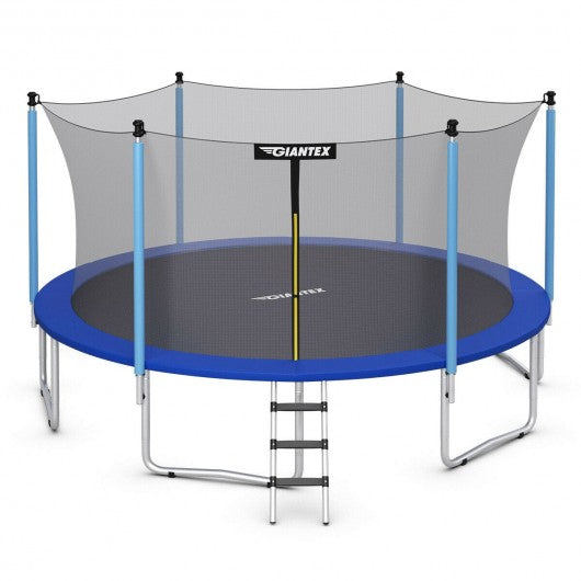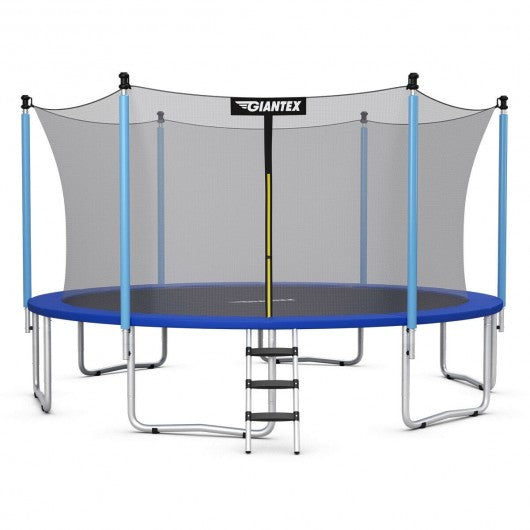 This high quality trampoline is aimed for bringing fun to you and your family while protecting their safety during use. This trampoline provides children with fun exercise while also helping to develop strong balance and coordination as well as strength and stamina. With a diameter of 12 feet and a maximum load capacity of 375 lbs adults can also enjoy jumping as well! You can have it in your playroom or backyard for various family activities gymnastics outdoor backyard fun competitive jumping and more. A great choice to keep your child active and entertained. If you are looking for this product don't hesitate to place an order! Rust-resistant galvanized steel construction with 6 W-shaped support legs for added stability 72 heavy-duty galvanized springs have better elasticity and deformation resistance 6 foam padded poles to support safety enclosure net for maximum durability and safety Sun-resistant and water-proof design enables it to withstand long term use even in humid and wet weather Double-sided zipper closure secures fast with extra safety buckles to prevent it from coming off No gap between the enclosure net and jumping mat to prevent accidental bruise Maximum load capacity is 375 lbs allowing more kids to enjoy jumping in the same time 3-step steel ladder offers convenient maneuverability when people want to join the game Breathable PP jump pads provide superior bounce performance Great choice to keep your child active and entertained in the backyard and more