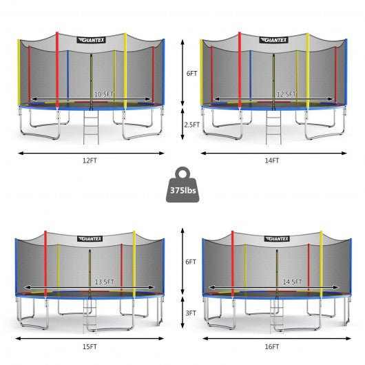 Specification: Color: Multicolored Material: PP + EPE + Steel + PE + PVC Product dimensions: 12ft x 8.5ft (D x H) Jumping area diameter: 10.5" Spring length: 5.5" Enclosure net height: 6" Spring amount: 64 Net weight: 121 lbs Weight capacity: 375 lbs Suitable age: 6 years old+ Package includes: 1 x Trampoline 1 x Trampoline ladder 1 x User's manual