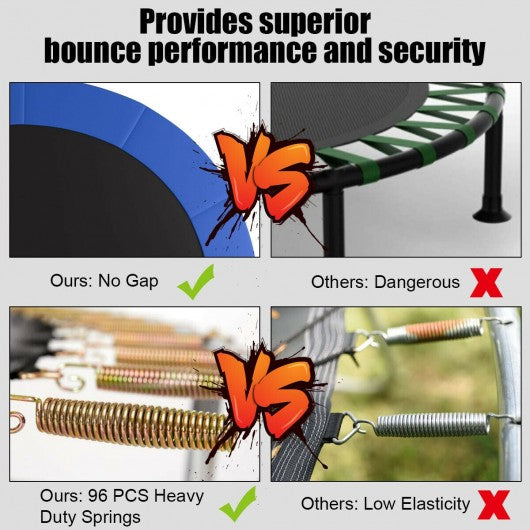 There is an excellent recreational trampoline for your family. The trampoline is made of rust-resistant galvanized steels and weather-resistant jumping cloth which is sturdy and durable. With 6 W-shaped legs this outdoor trampoline provides a load-bearing capacity of up to 375lbs. The protective enclosure net and foam wrapped poles strengthen the impact protection to prevent your child from being injured by accidental impact when jumping. The seamless design between the fence net and the mat keeps your child from getting stuck in the gap. Moreover the heavy duty springs with good elasticity provides a better jumping performance and long term use. What�s more the trampoline with basketball hoop has a large activity space which can enrich social life and promote parent-child interaction. Do not hesitate you and your family will love it! If you are looking for this product don't hesitate to place to order! Rust-resistant galvanized steels for longer service time 96 heavy-duty galvanized springs have better elasticity and deformation resistance Trampoline with basketball hoop gives you more sports choices Enclosure net and no gap design gives a safe sports environment Large space and high weight capacity is suitable for adults and kids 6 W-shaped support legs are evenly distributed for more stable construction Sun-resistant and water-proof trampoline is suitable for long-term outdoor use Breathable PP jump pads provide superior bounce performance Ladder and double-sided zipper are designed to help you quickly enter the trampoline All standing poles are wrapped with EPE foam to prevent kids from being injured