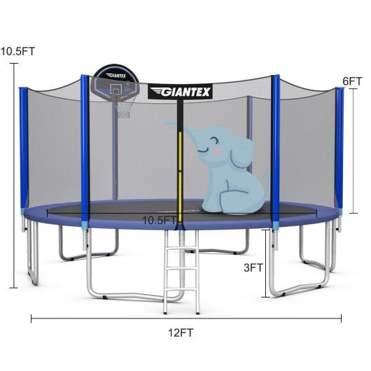 Specification: Color: Black/blue/sliver Material: Steel PP EPE PVC PE Product size: 12' x 12'x 10.5' (L x W x H) Net weight: 154 lbs Weight capacity: 375 lbs Applicable age: 6 years old+ Package includes: 1 x Trampoline 1 x Basketball hoop 1 x Trampoline ladder 1 x Installation tool 1 x User's manual