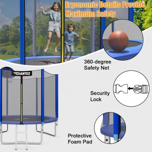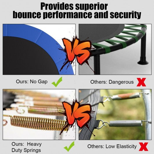 There is an excellent recreational trampoline for your family.The trampoline is made of rust-resistant galvanized steels and weather-resistant jumping cloth which is sturdy and durable. With 6 W-shaped legs this outdoor trampoline provides a load-bearing capacity of up to 375lbs. The protective enclosure net and foam wrapped poles strengthen the impact protection to prevent your child from being injured by accidental impact when jumping. The seamless design between the fence net and the mat keeps your child from getting stuck in the gap. Moreover the heavy duty springs with good elasticity provides a better jumping performance and long term use. What’s more the trampoline with basketball hoop has a large activity space which can enrich social life and promote parent-child interaction. Do not hesitate you and your family will love it! Rust-resistant galvanized steels for longer service time 108/96/72 heavy-duty galvanized springs have better elasticity and deformation resistance Trampoline with basketball hoop gives you more sports choices Enclosure net and no gap design gives a safe sports environment Large space and high weight capacity is suitable for adults and kids 6 W-shaped support legs are evenly distributed for more stable construction Sun-resistant and water-proof trampoline is suitable for long-term outdoor use Breathable PP jump pads provide superior bounce performance