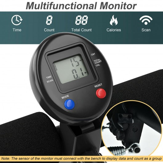 This premium weight bench with 5 adjustable positions meets different workout needs and achieves better fitness results. This adjustable weight bench is the perfect solution for you! Besides thanks to the multifunctional design this weight bench allows you to do various exercises such as sit-ups decline bench presses and leg raises etc. Besides the clear monitor shows all relevant training information in real-time such as time count total count and calories. Additionally by adjusting the bottom board this sits up bench can be transformed into a dumbbell bench for great convenience. And multiple high-density foam rollers protect your body while helping you exercise. Constructed of a heavy-duty steel frame this high-quality weight bench is stable enough to hold up to 287 lbs. With the foldable design this adjustable weight bench is easy to store. If you are looking for this product don't hesitate to buy it! Full body workout to train different muscles Suitable for sit-ups decline bench presses and leg raises etc Satisfies different requirements with 5 adjustable positions Clear monitor for real-time feedback of different data Serves as dumbbell bench by adjusting the bottom board Strong loading capacity up to 287 lbs Heavy-duty steel frame with a triangular design for stability Protects your body while helping you with multiple cozy foam rollers Wear-resistant PU leather and non-deformable foam comfortable workout experience Footpads on the bottom increase the stability and prevent wearing the floor Easy storage to save home space with foldable design Convenient fitness equipment for home office and gym
