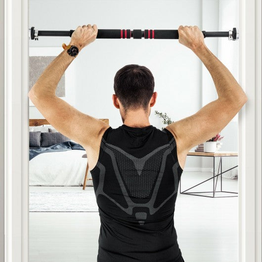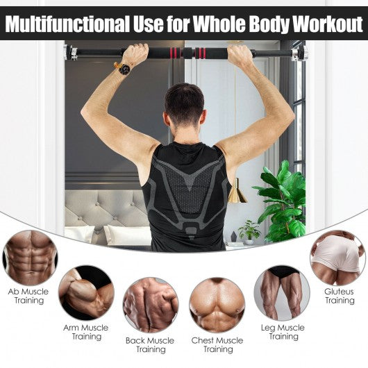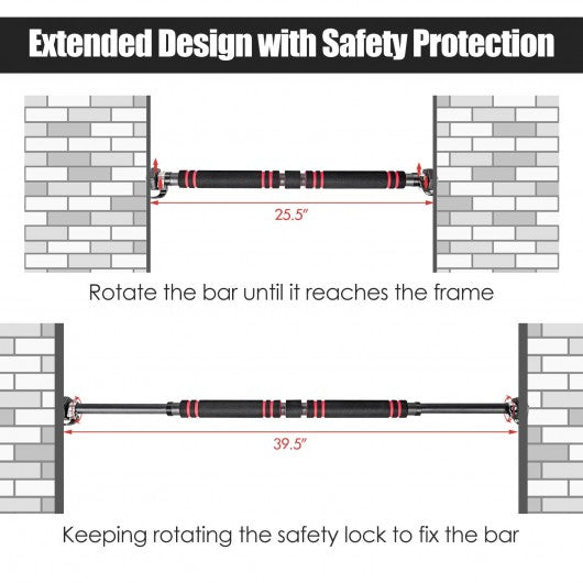 Crafted with sturdy iron material the bar allows for daily use and can support up to 264 lbs. It aims to avoid deformation and keep steady during training. More importantly the multi-functional bar allows you to perform different workouts such as chin-ups pull-ups sit-ups push-ups etc. With the bar you can incredibly build up muscles over your body such as shoulders chest back biceps triceps abs. What’s more the pull-up perfectly fits most doors and comes with easy installation. With no screws needed you can easily hang it on the door or put it on the floor for multi-purpose use. If you are looking for a product like that do not hesitate to buy it! Quick and easy installation with no screws needed Supports up to 264 lbs to suit both women and men With heavy-duty iron frame to keep steady during training Features rubber rings to protect the door frame from scratches Adjusted from 25.5” to 39.5" to fit most standard door frames The soft foam grip is adapted to offer a better fitness experience and avoid slipping It comes with a locking mechanism to prevent dangerous rotation and loosening Allows you to perform different workouts to strengthen your back arms shoulders and abs muscles The lightweight structure makes it convenient to use and transport Ideal tool for people who love sports and exercise also for those who need to lose weight