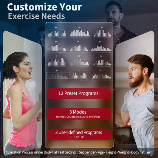 Are you still bothered by the lack of a gym near your home? Pick this folding treadmill and workout at home! When you receive the package you just need to unbox it and unfold the treadmill. Then the wonderful running ex perience will begin. The 5-layer anti-slip and shockproof running belt as well as the 3.75HP quiet and powerful motor provide a better running ex perience without disturbing others. During running the full-functional LCD display will show you the needed ex ercise data (speed time distance calories and heart rate). If you want to save every ex ercise data just connect your phone with the Gymax APP via Bluetooth (Media). And the Bluetooth speaker and device holder make ex ercise less boring. After running you can fold the treadmill to a compact size and then move it to the desired storage space. If you are looking for a treadmill like this do not hesitate to place an order! Clear LCD screen displays speed time distance calories and heart rate Put your hands on the heart rate sensors to monitor your heart rate Adjust the intensity of your workout with 12 preset programs 3 modes and 3 user-defined programs No need to assemble for time-saving Foldable treadmill with built-in wheels for easy movement and storage Make treadmill freestanding storage with U-shaped base Bring an effective and safe cushion for your knees with 5-layer running belt 3.75HP powerful and quiet motor for perfect running performance Adjust the speed from 0.6 mph to 9 mph for walking jogging or running Use Bluetooth (Media) to connect your phone with the smart Gymax APP Put your phone on the device holder and listen to the music through the Bluetooth speakers Please do not place the treadmill on carpet during usage to avoid motor overheat