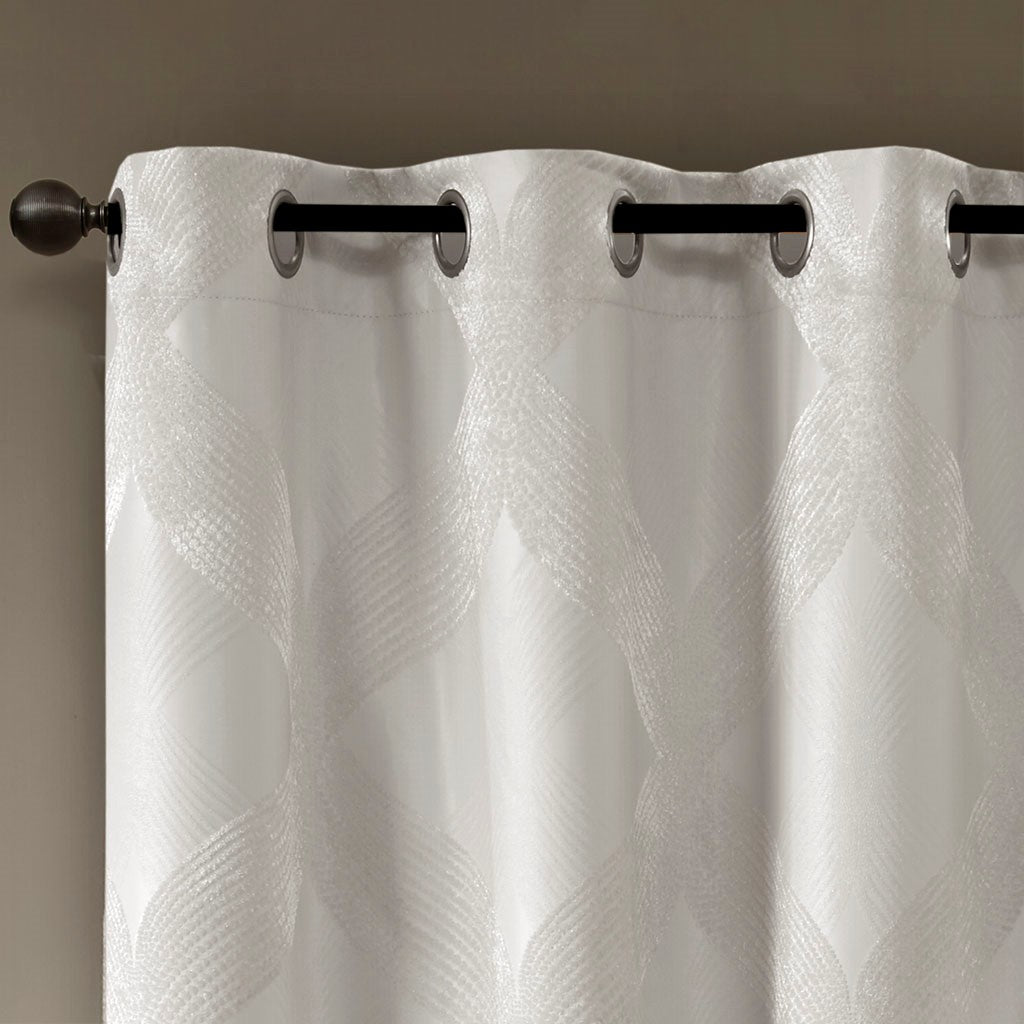 Combining luxe style with functionality, our SunSmart Bentley Ogee Knitted Jacquard Total Blackout Panel is the perfect update to dress any window. An ogee knitted jacquard design is featured in a rich ivory hue, creating a luxurious sheen and texture. The heavy fabric uses a foamback and bonding finish enhancing the panel to block out all sunlight, provide a maximum protective barrier against noise intrusion, and offer a maximum level of privacy and energy savings. A silver grommet top finish makes it easy to hang, open, and close panels throughout the day; fits up to a 1.25 diameter rod. With 100% total blackout properties, this window panel is the perfect addition for bedrooms, media rooms, or any private spaces, giving your home a lavish and contemporary appeal. Lighting level: Pitch Black Ambiance.