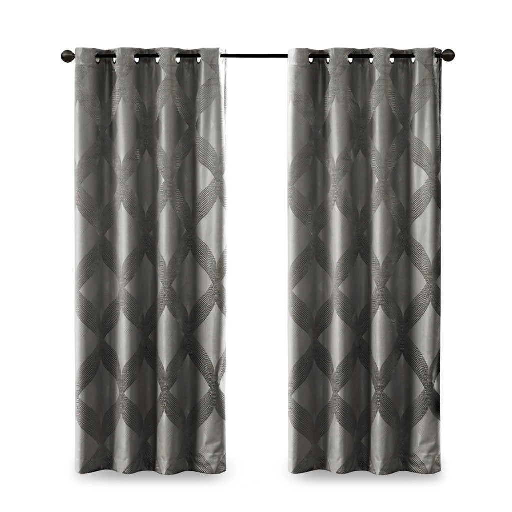 Combining luxe style with functionality, our SunSmart Bentley Ogee Knitted Jacquard Total Blackout Panel is the perfect update to dress any window. An ogee knitted jacquard design is featured in a rich charcoal hue, creating a luxurious sheen and texture. The heavy fabric uses a foamback and bonding finish enhancing the panel to block out all sunlight, provide a maximum protective barrier against noise intrusion, and offer a maximum level of privacy and energy savings. A silver grommet top finish makes it easy to hang, open, and close panels throughout the day; fits up to a 1.25 diameter rod. With 100% total blackout properties, this window panel is the perfect addition for bedrooms, media rooms, or any private spaces, giving your home a lavish and contemporary appeal. Lighting level: Pitch Black Ambiance.