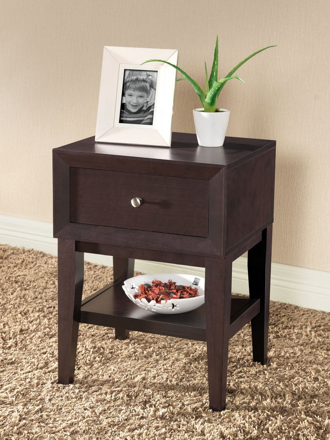 The Gaston petite modern end table excels in both the living room and bedroom without missing a beat. This svelte designer living room table is made of engineered wood and veneered with dark brown faux wood grain paper before being finished off with non-marking feet. A single drawer with silvertone knob is set above a small shelf to keep your important items close at hand. Made in Malaysia, this designer nightstand requires assembly and should be dusted clean with a dry cloth. Dimension: 17.875"Wx15.875"Dx24.625"H, shelf dimension:16.5"Wx11.5"Dx6.5"H, drawer dimension:13.125"Wx11.5"Dx3.5"H