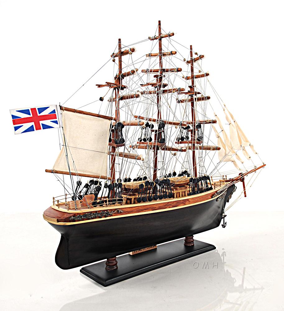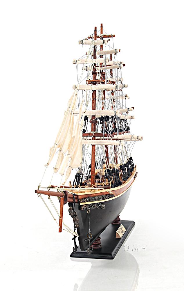 Our Cutty Sark model is scratched built plank on frame and strip by strip of exotic wood put together. It is completely hand built by skillful and creative master craftsmen; you will be amazed at how real it looks. The hull is truly beautiful, combined with skills and pure wood, the hull is smoothening out equally giving a shiny and silky feel on side of the hull. On the ship, you can easily locate stunning wooden details such as: 3 wooden booms, 1 wooden bunker, 4 front and 1 main masts with fabric sails and detailed stitching, all rigging are matching colors, 4 wooden boats, 2 wooden storage room, 2 metal fences on the front and back of the ship, 2 metal ornaments embedded with Cutty Sark locating in the back and front left of the ship, 2 metal anchors, 1 metal statue in front of the ship, and many more. We absolutely use no plastic parts only the highest quality wood and metal. Our model was built according to scale through original plans, pictures and drawings. Attached to this model is a wooden stand with a metal name plate embedded “Cutty Sark 1869”. This model is being ship inside a secure wooden crate; it comes fully-assembled and ready to be display.