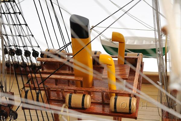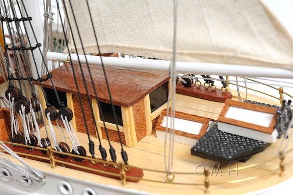 Display this model of the 253 foot full-rigged ship built and launched in 1932 in Lolland, Denmark right in your own home or office! The Danmark, commissioned in June 1933 she was constructed for use as a sail training ship, is available as a museum-quality, FULLY ASSEMBLED model. Master craftsmen using historical photographs, drawings or original plans meticulously handcraft these highly detailed wood models from scratch. They are built to scale with high-grade wood such as: western red cedar, rosewood, and mahogany. They are 100% hand built individually using plank-on-frame construction method and are similar to the building of actual ships. Each model requires hundreds of hours to finish and must go through a demanding quality control process before leaving the workshop. This Danmark model has distinctive two tone colors paint on the hull. It also features plank on frame, three decks, and a row of portholes on each side of the ship. The front bowsprit and three large masts are connected securely using advanced rigging and lines painstakingly knotted and fastened by hand. Each yard has an attached hand-stitched unfurled sails made of fine linen. Metal anchors and a wooden rudder are visible on the front and rear of the ship. On the deck, there are painted authentic hand-built lifeboats with ribs and planks, wooden capstan, wooden cabin, painted wooden light beacons and smoke stack, wooden ladders, and many other handcrafted ornaments. This model comes standard with a solid wood base and brass nameplate. It’ll make a perfect gift for home or office decorator, boat enthusiast or passionate collector.