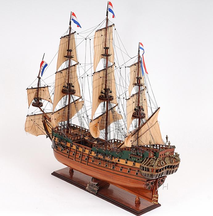 The Friesland was a part of the Great Fleet of the United Province of Holland. It was built with 80 guns around 1663 and consisted of 1700 units. In 1672 it sided with 77 vessels under De Ruyters command and took part in the battle of Solebay with the Allied Anglo-French forces. The ship whose hull was carved out of wood is particularly noted for the refinements on her poop deck decorations and her superstructure.
