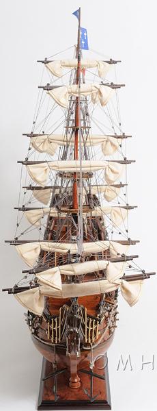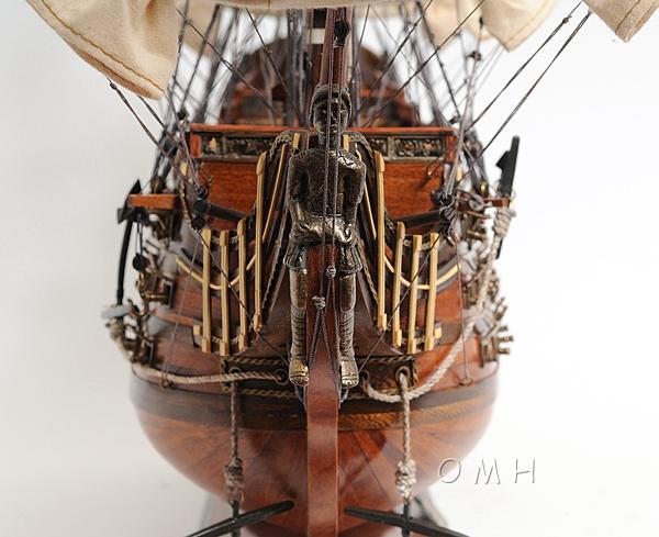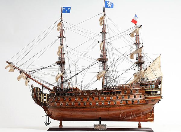 This is a magnificent museum quality model of the Royal Louis. It was 100% hand built “plank on the frame” by the master craftsmen. This model is made of mahogany and teak. Stripes of rosewood were added to increase its exotic value. Around her hull, you can see brass cannons, brass rails and fittings, a big brass figurehead in front of the bow, beautiful art works around the stern. On the deck, there are stairs connected different floors; a big wooden dinghy that comes with its own paddles, sky light panel, ship wheel, ship bell…etc. The details are just amazing. It takes hundreds of hours to build the hull and the riggings. The model comes with its original French flags and rest on a steady wooden base with attached metal name plate. This is an exclusive edition of the Royal Louis, where the model is uniquely identified by a laser cut hull serial number.