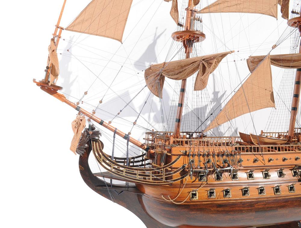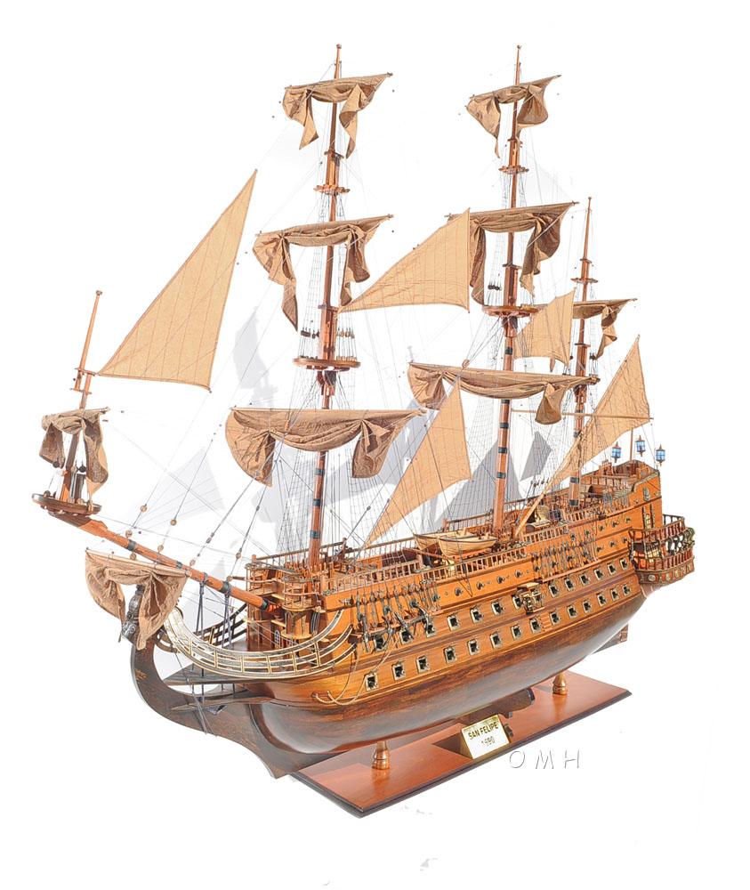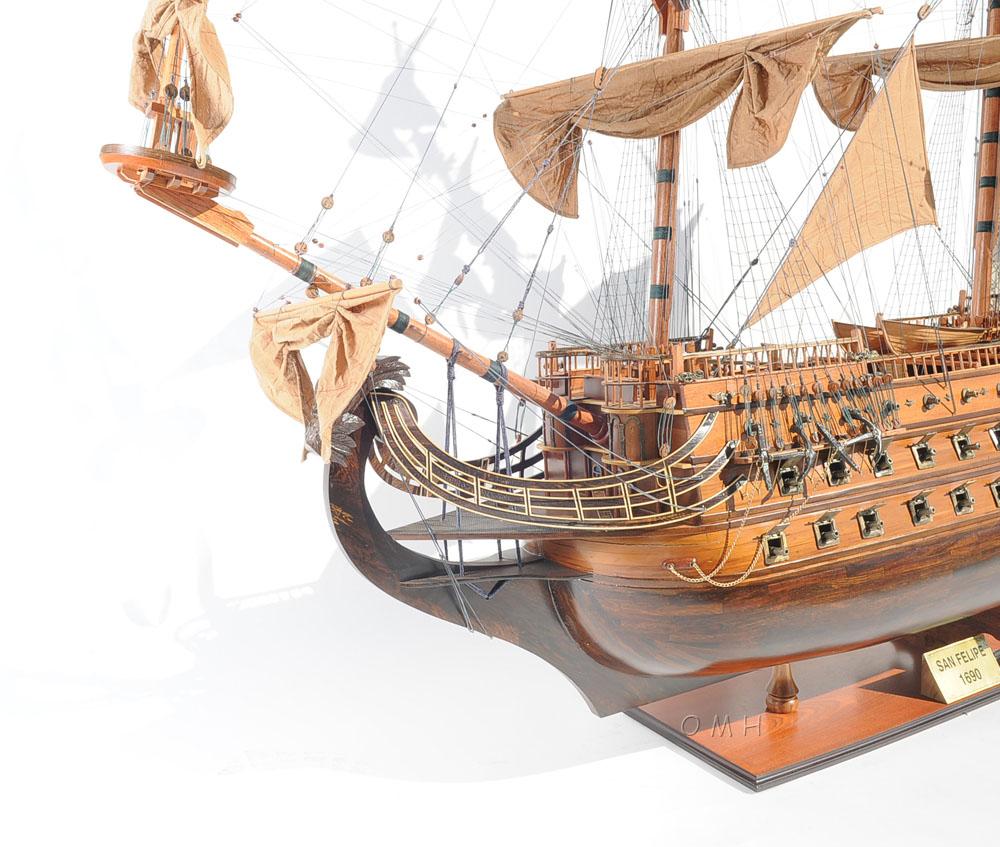 This is a ginormous 7.3 feet long museum-quality replica of San Felipe, one of the most beautiful Spanish galleons of the XVII century. This is an “Exclusive Edition” where the model has a unique serial number etched into the hull, which allows us to identify production date, the material used and all other production information of a model. Master craftsmen using historical photographs, drawings or original plans meticulously handcraft these highly detailed wood models from scratch. They are built to scale with high-grade wood such as western red cedar, rosewood, and mahogany. They are 100% hand built individually using plank-on-frame construction method and are similar to the building of actual ships. Each model requires hundreds of hours to finish and must go through a demanding quality control process before leaving the workshop. This massive San Felipe XXL model features plank on frame, three decks, and three rows of ferocious cannons on each side of the ship. A unique bowsprit design that consists of brass statues and crafted brass ornaments on the panels. The front bowsprit and three large masts are connected securely using advanced rigging and lines painstakingly knotted and fastened by hand. Each yard has an attached hand-stitched rolled-up sail made of fine linen. Metal anchors and a wooden rudder are visible on the front and rear of the ship. On the deck, there are metal stationed cannons, authentic hand-built lifeboats with ribs and planks, wooden cabin, and many other handcrafted ornaments. There is also an exquisite detailed admiral’s quarter on the stern with a beautifully handcrafted metal lantern, amazing metal crafted statues, and many other spectacular brass ornaments. This model comes standard with a solid wood base and brass nameplate. It’ll make an incredible display for your home or office or company. Definitely have the "wow" factor for any decorator, boat enthusiast or passionate collector. Important Note: Please be aware that this canoe is a SPECIAL ORDER item which means right after you have placed the order, it will take about 30-60 days for us to built and ship it to you.