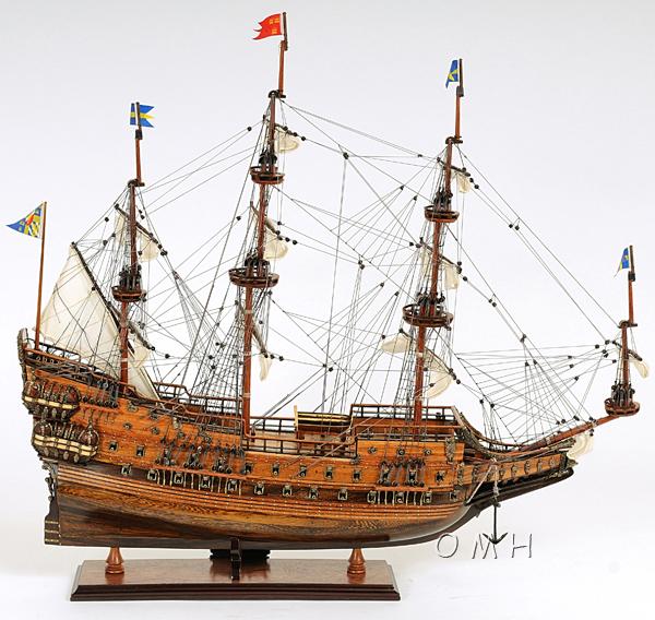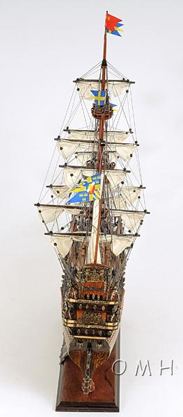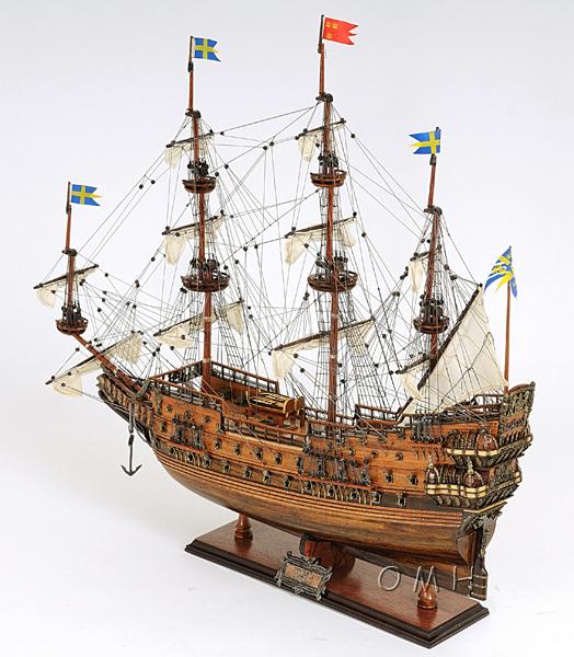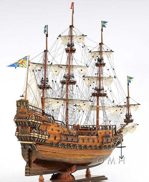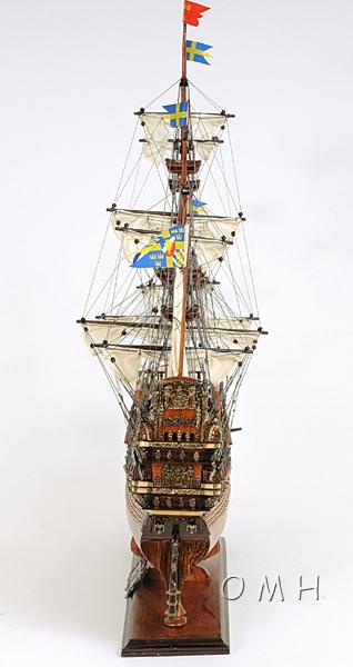 This is Museum-quality, Fully Assembled edition of the Wasa. It is part of an exclusive edition where the hull is laser cut with a unique serial number. The model is 100% hand built from scratch using “plank on frame” construction method. Our master craftsmen have spent more than 100 hours to finish it. One bold feature that makes this model standout is the art of wood use. Rosewood, mahogany, teak and other exotic woods are carefully selected to accent each part of the model. This replica has magnificent details which include metal anchors and cannons, authentic crows nest, advanced rigging, rolled sails and an ornate stern. No plastic parts! Comes on a solid wood base, with metal nameplate.
