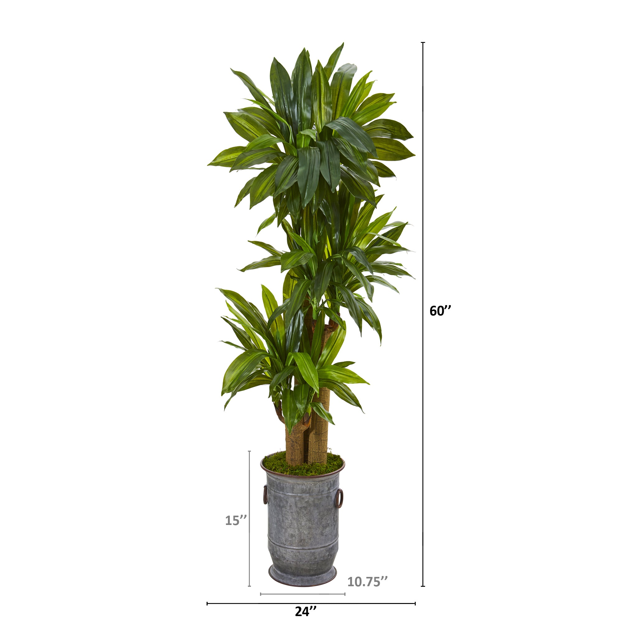 Evoke natural beauty with the help of this artificial corn stalk dracaena plant boasting a rich collection of intricately designed greenery in bright, vivid hues, stemming from realistic textured trunks - all of which feel real to the touch. Standing 5' high from a vintage metal planter, this fake plant evokes a hint of tropical beauty wherever displayed.